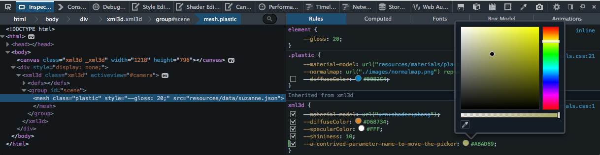 Debugging an XML3D scene that uses our proposed CSS integration model. It is now possible to change, add or remove material parameters right within the well-known debugging facilities of today's browsers (here: Mozilla Firefox)